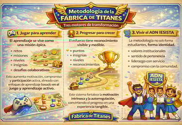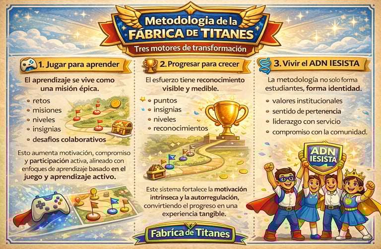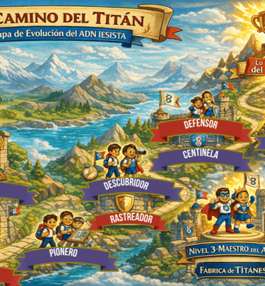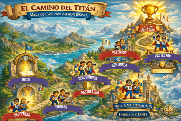El Camino del Titán es el sistema de progreso de la Fábrica de Titanes en el que los estudiantes avanzan por niveles: Explorador, Guardián, Maestro y Titán. desarrollando liderazgo, carácter y propósito mientras conquistan insignias que revelan su ADN IESISTA.